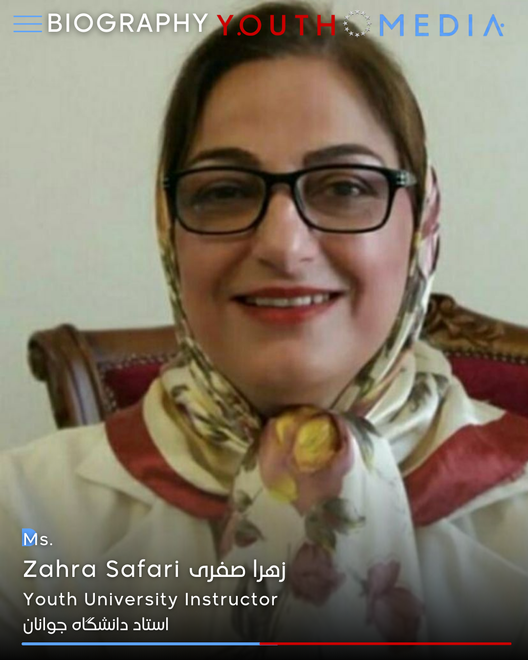 استاد دانشکده روانشناسی دانشگاه جوانان افغانستان زهرا صفری بعنوان یکی از اساتید دانشکده روانشناسی، نقش بسزایی در ارتقای سطح علمی و پرورش تفکر اجتماعی جوانان از دیدگاه جامعه شناسی ایفا میکند. او تحصیلات عالی خود را در یکی از دانشگاههای مهم تهران به پایان برد و موفق به اخذ مدرک کارشناسی ارشد در رشته مشاوره به پایان رساند. و هم چنین نگرش عمیقی به مسایل اجتماعی و روانشناسی جامعه دارد و در حوزه تخصصی درمانی و تحقیقاتی کار زیادی انجام داده او ۱۷ سال سابقه کاری در حوزه درمانی و اموزشی و پژوهشی دارد. علاوه براین چاپ مقالات علمی با عنوان ، واکاوی فرایند شکل گیری مداخلاتی خشونت خانگی زوجین در دوران پساکرونا و همچنین مقاله ای در زمینه، چالش های ازدواج و خانواده منطقه ای و فرامنطقهای دارد. و نیز چاپ مطالب مهارت های زندگی در مجله علمی دانشگاه مدیریت صنعتی یکی از دانشگاههای ایران به ثبت رساند و هم چنین در حوزه اداره سلامت مبادرت به برگذاری کارگاه هایی در مدارس و ادارات تهران دارد. او در دوره های تخصصی از جمله دورههای نورساینس دورههای CaBT دورههای زوج درمانگری دورههای آموزش پیش از ازدواج گذراند او معتقد هست که همه انسانها برای توانمندسازی خود نیاز به دانش و آگاهی دارند.
